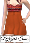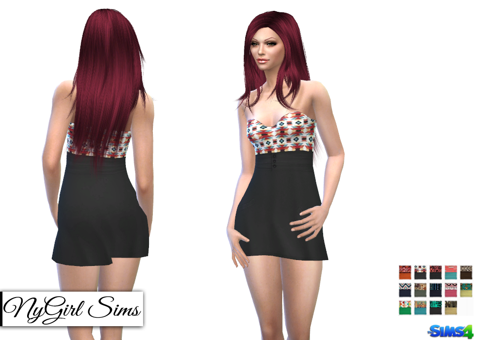 Strapless mini dress with tribal patterned top, pockets and a buttoned sash. Made from a mixture of TS3 and TS4 textures as well as fabric samples. Comes in 14 presets.