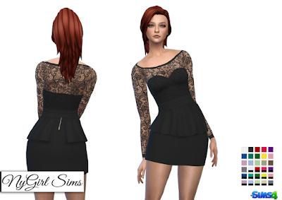 Peplum mini dress with lace shirt overlay. I used the peplum dress mesh by EA on this but took off the sleeves and shortened the skirt a bit. It was a bit of a headache but after hours of fiddling around I am really please with the results. Made from a mixture of TS4 and TS3 textures. Comes in 10 presets, 16 solid colors and 14 duo colored dresses.